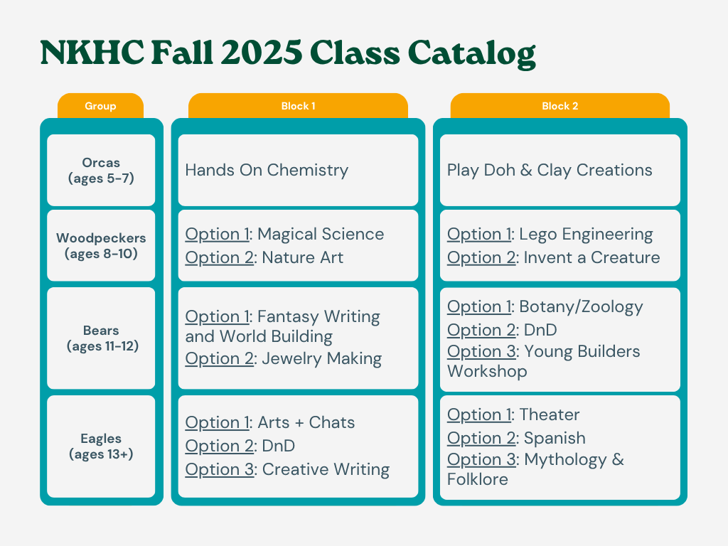 At NKHC, kids collaborate, create, and connect in meaningful ways—through hands-on classes, real friendships, and a supportive, in-person homeschool community.